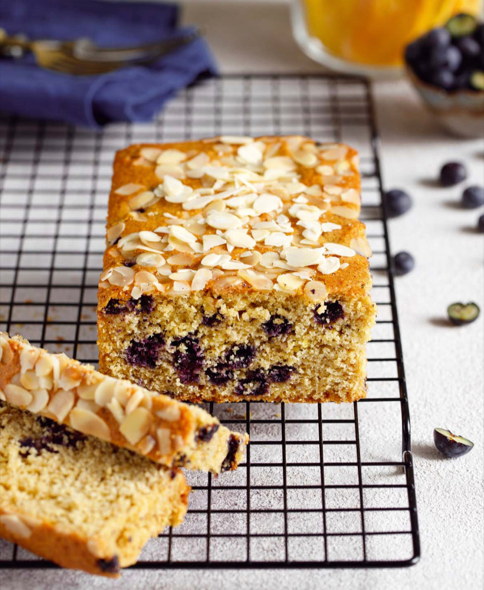 ingredients: oat bran flour, almond flour, corn flour, eggs, coconut oil, sweetener, agave or maple syrup, blueberries, lemon, almond flakes, baking powder, baking soda, vanilla extract