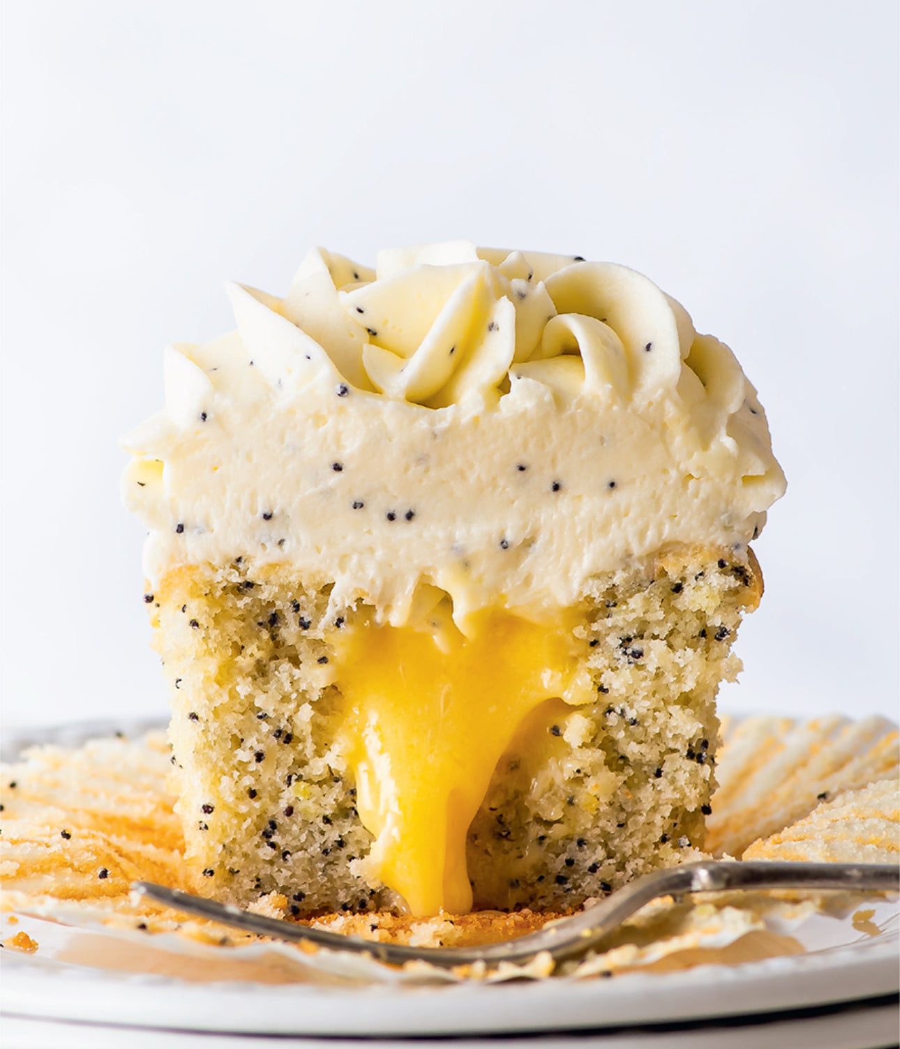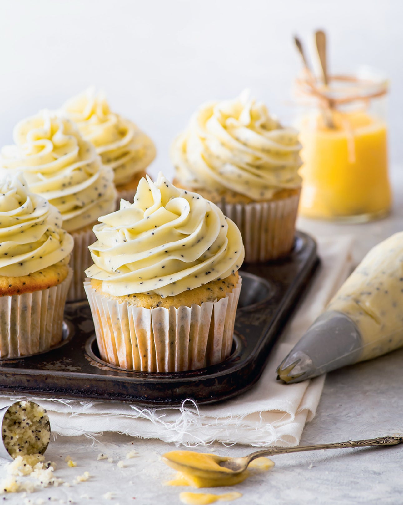 These gluten-free lemon chia seeds cupcakes with lemon curd and Swiss Meringue Buttercream simply make people happy. From the very first bite you encounter the fluffiness of the cream, the freshness of a bright lemon curd filling, to the burst of lemon zest in the sponge, there is definitely something special about them.