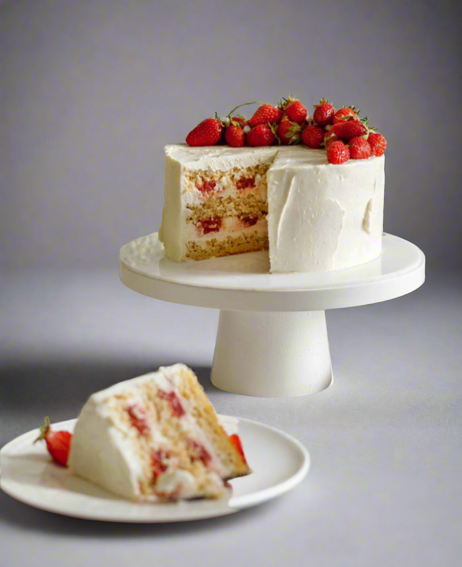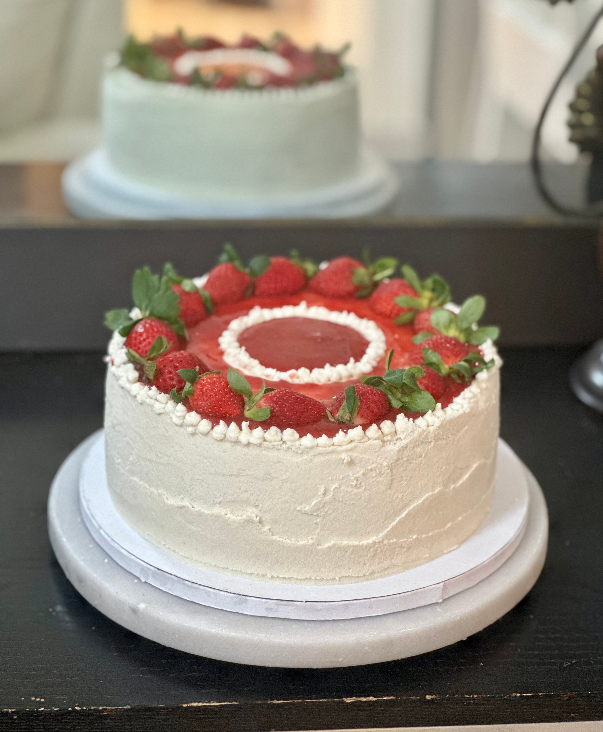 Vegan vanilla almond cake, 3 layers of moisture sponge layered with strawberries filling
