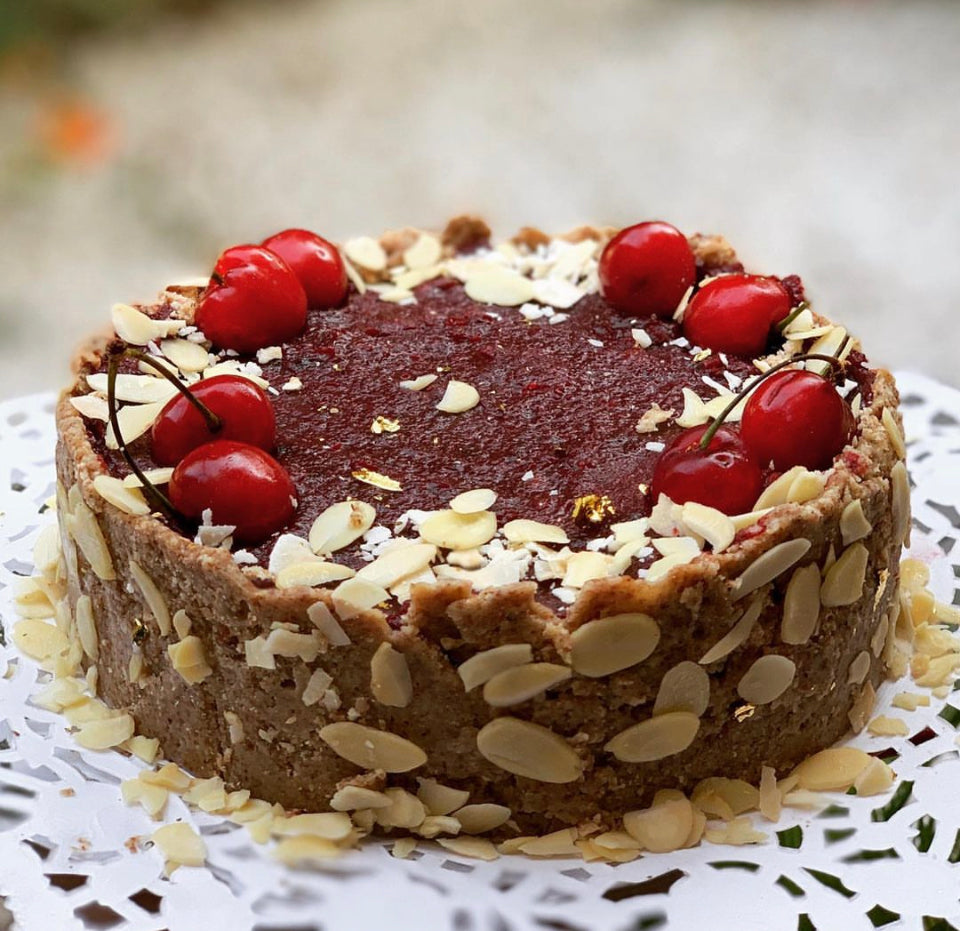 Flourless, Gluten-free, refined sugar free, dairy free, eggs free almond tart with cherries.
