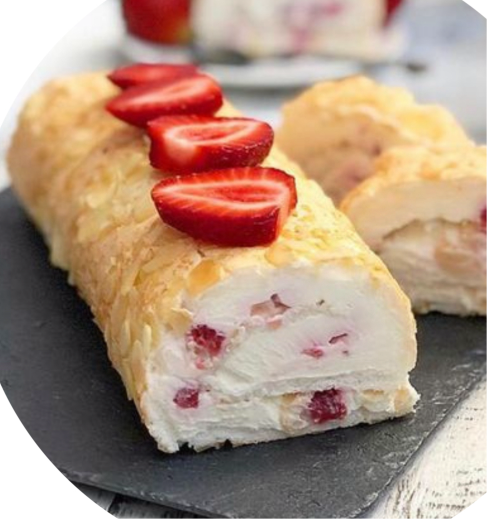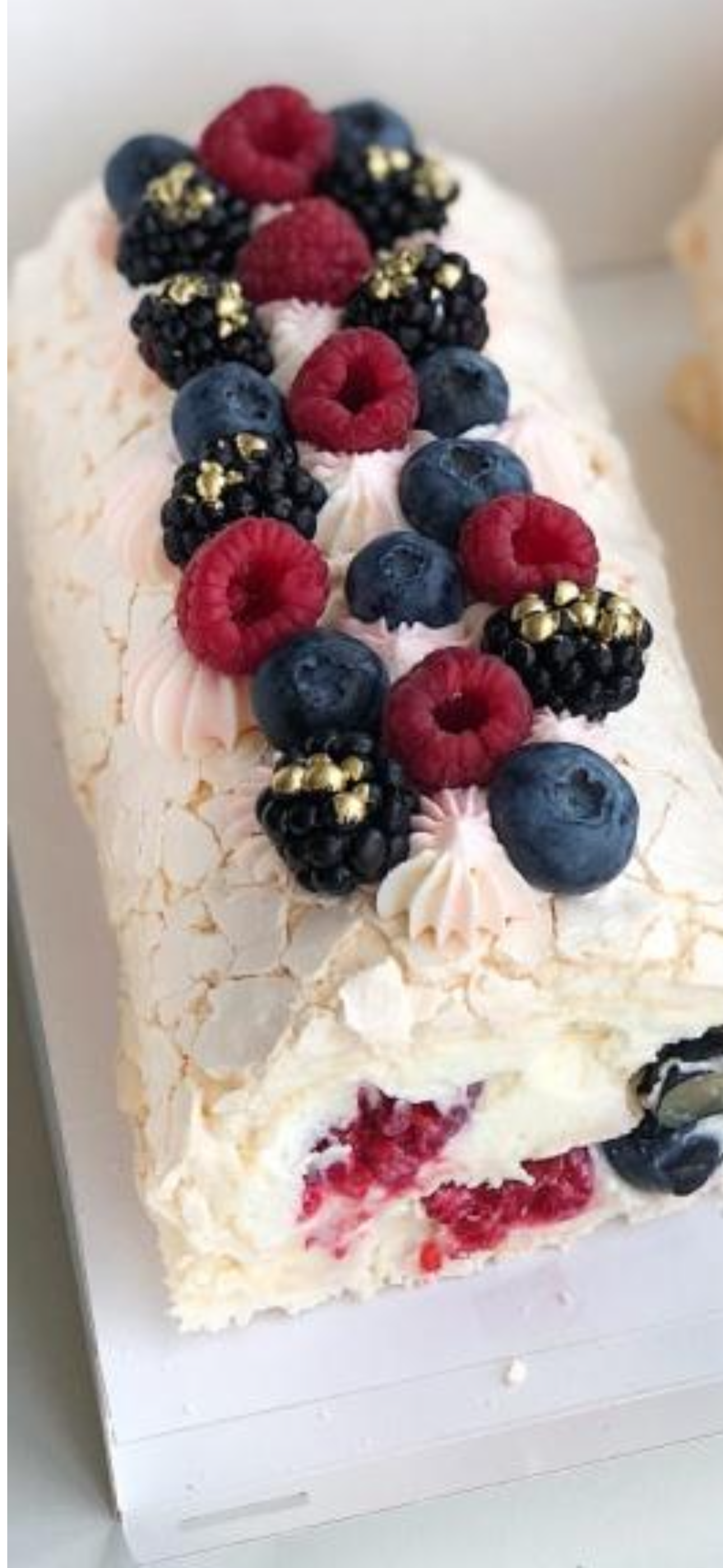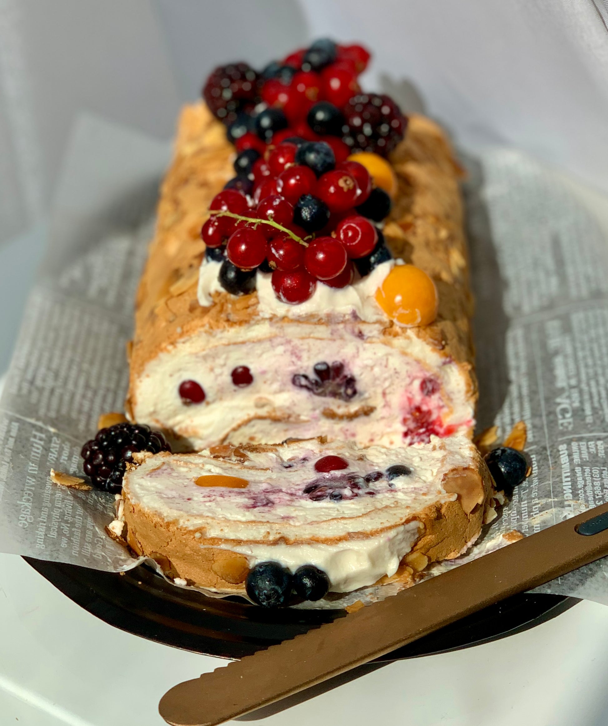 Ingredients for Berry meringue roll: free-range eggs, organic sugar replacement, cottage cheese cream, ricotta, organic syrup, berries, almond flakes, vanilla extract
