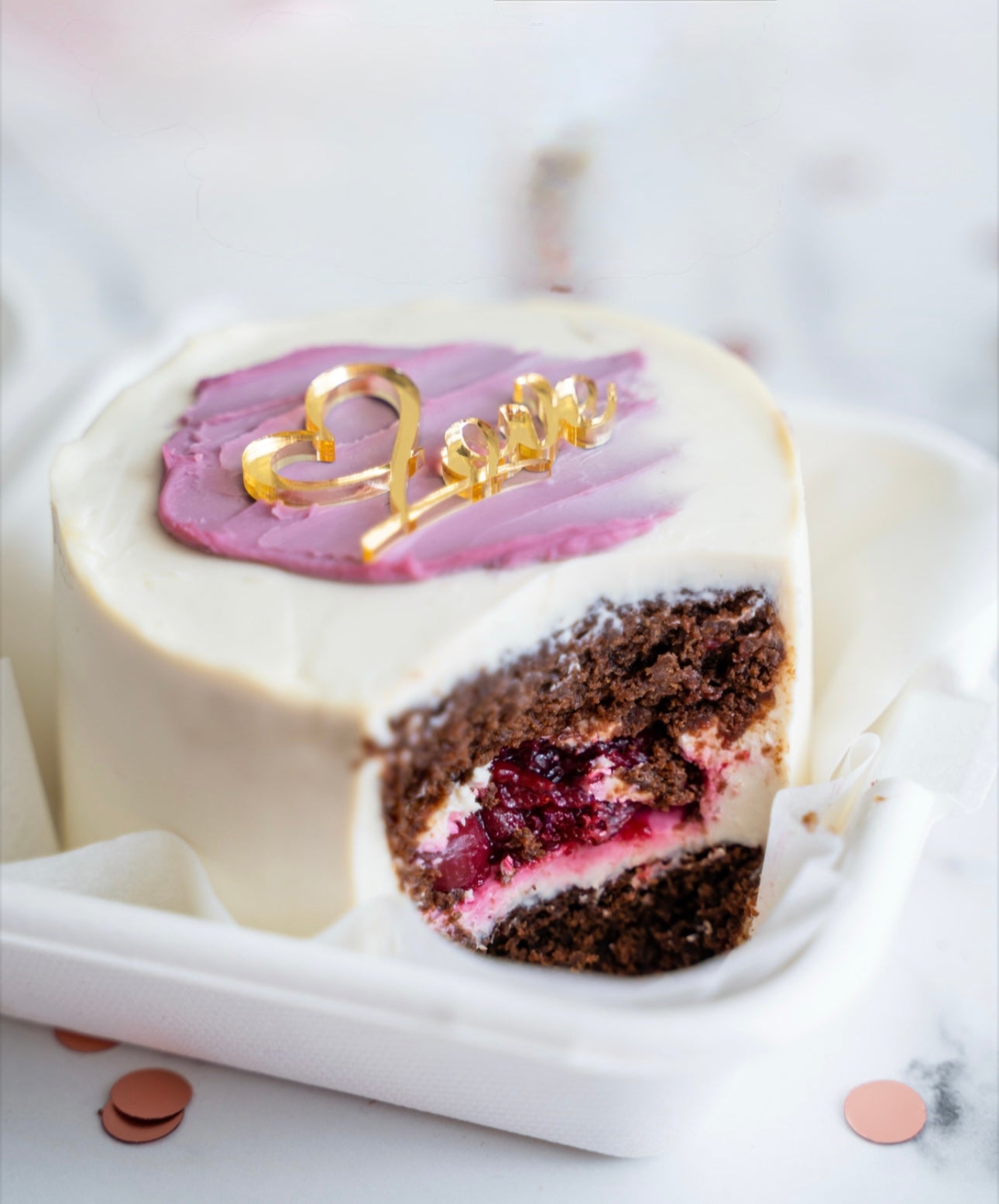 Enjoy a delectable chocolate baby cake with a fruity cherry filling and creamy vanilla buttercream. Made without gluten, indulge in this guilt-free treat for 1-2 people. Satisfy your sweet tooth while catering to dietary restrictions.