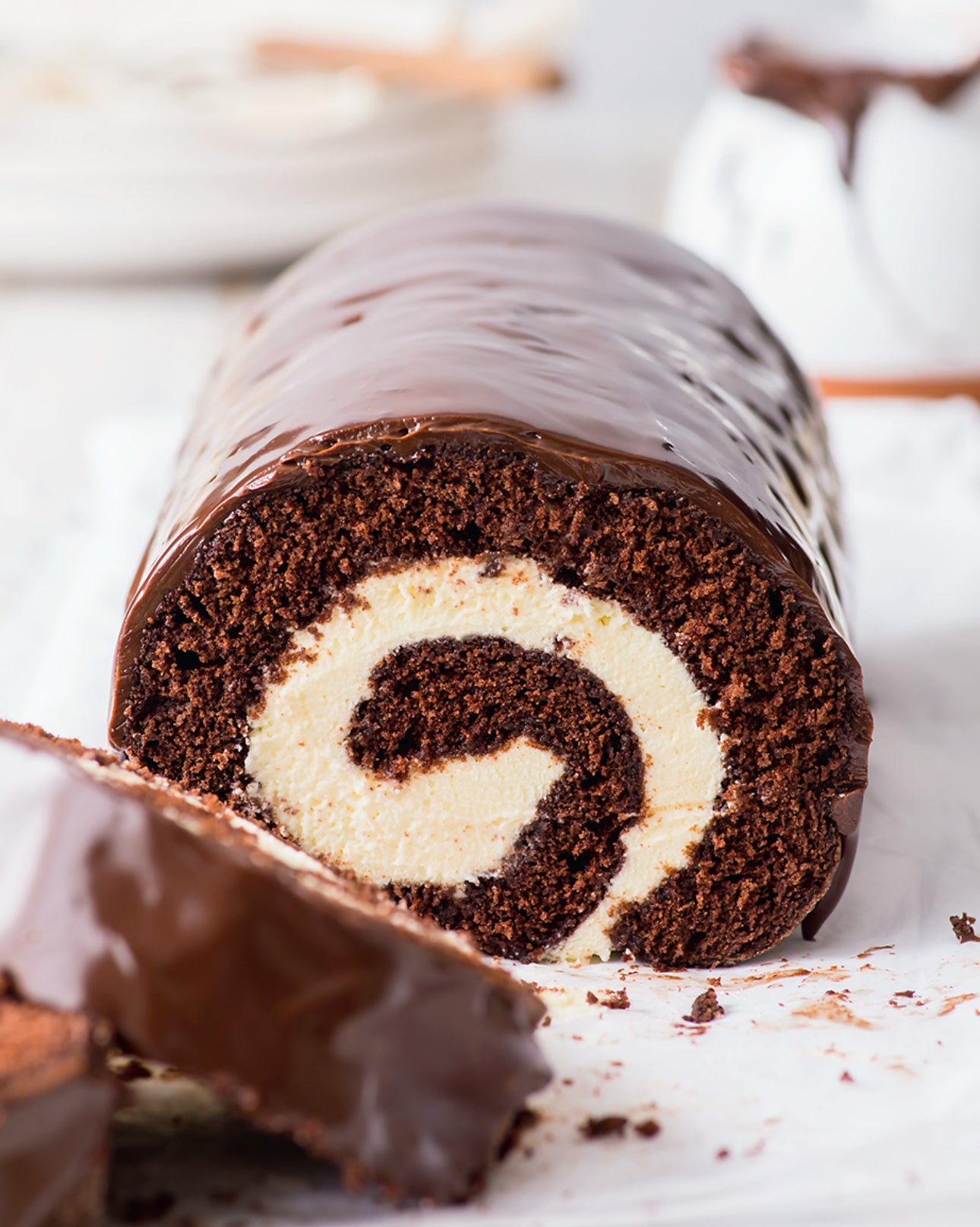 The perfect swirl of moist chocolate sponge and mascarpone-whipped cream frosting Swiss Chocolate roll.